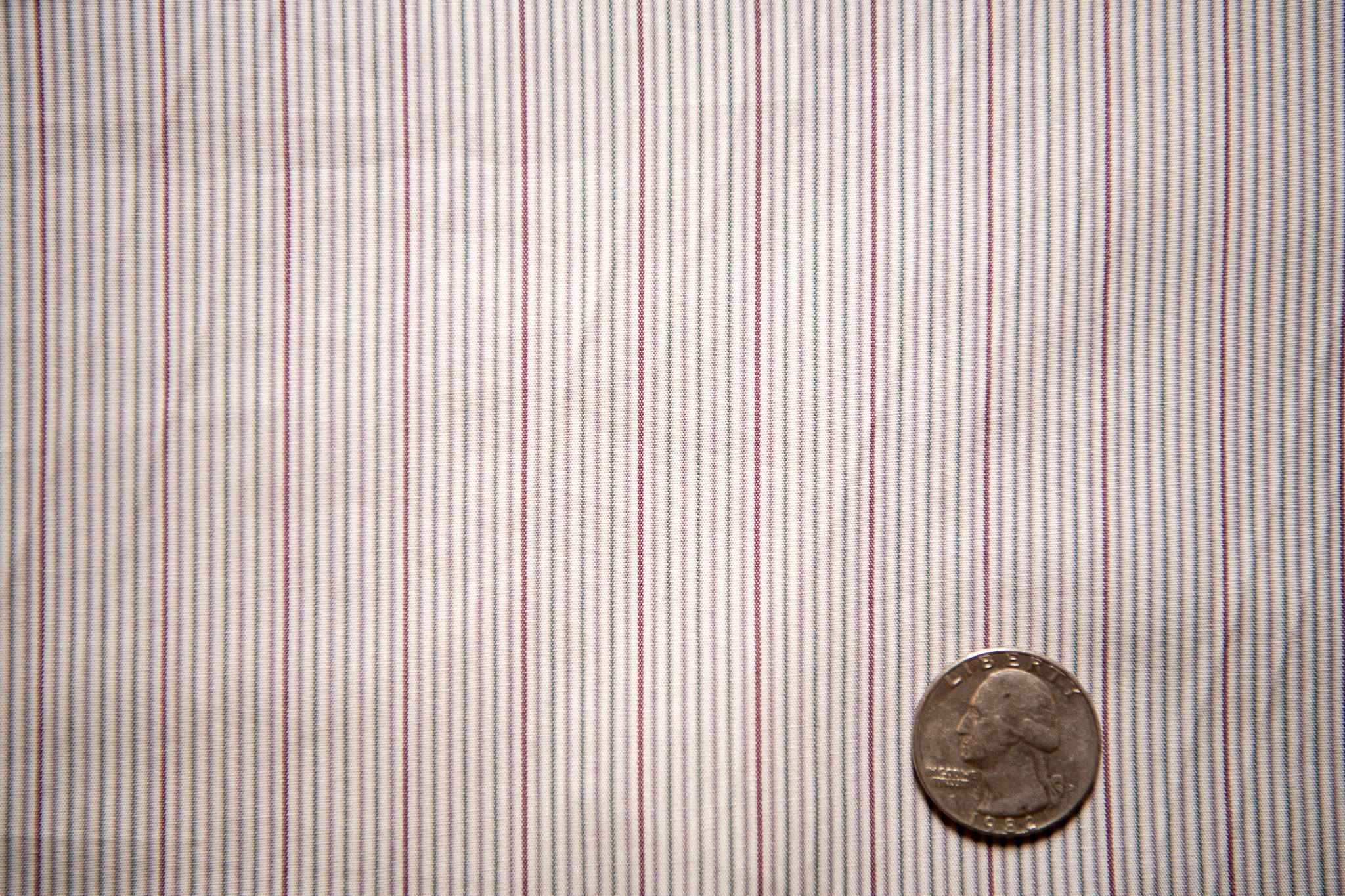Multi Micro Cotton Stripe has a clean white background featuring burgundy, blue, and grey stripes woven in a fine, orderly pattern. The stripes are delicate enough to keep the fabric subtle overall, yet they add a pleasant bit of detail when viewed up close.