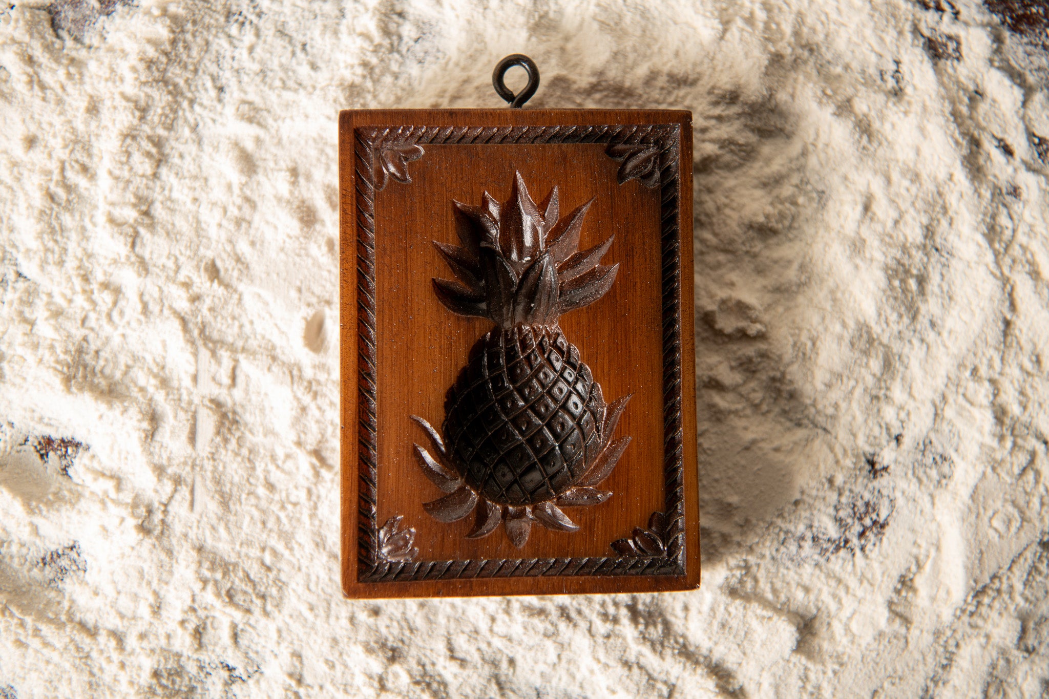 This mold features a pineapple motif—long associated with warmth and welcome—carved with crisp, traditional detail. Measuring approximately 2.75 by 3.75 inches, it creates a clear, raised impression in dough, making it well-suited for spiced cookies, speculaas, springerle, or other molded treats. A light dusting of flour helps the dough release cleanly, just as historic kitchen guides advised.